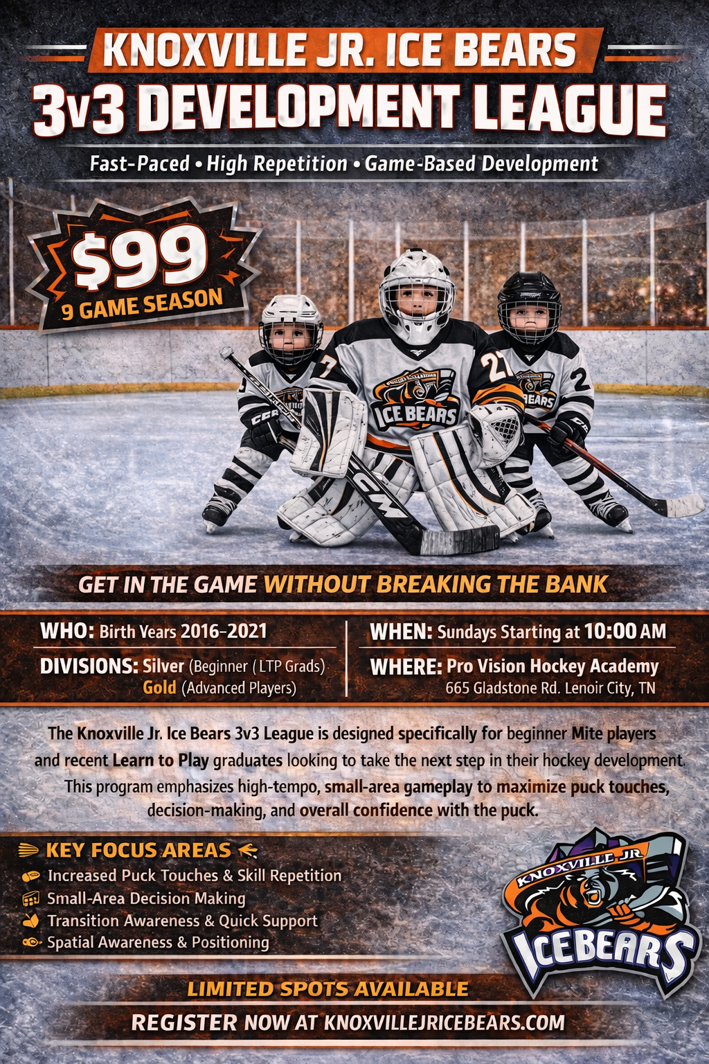 The Knoxville Jr. Ice Bears 3v3 League is designed specifically for beginner Mite players and recent Learn to Play graduates looking to take the next step in their hockey development. This program emphasizes high-tempo, small-area gameplay to maximize puck touches, decision-making, and overall confidence with the puck.