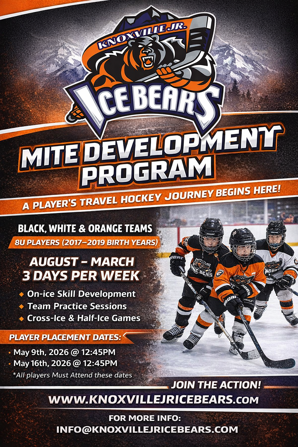 Our Mite Development Program is designed as the true starting point of a player’s travel hockey journey, providing a structured and competitive environment for young athletes ready to take the next step. The program features three teams Black, White, and Orange organized to ensure proper development, balanced competition, and clear progression within the program.